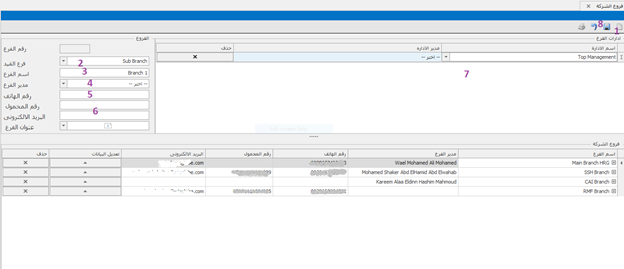 1- إنشاء فرع جديد . 2- اختيار فرع القيد و هى تلك الفروع المنشأة من الحسابات العامة و التى ستتحول حركات هذا الفرع الجديد إليه من حيث القيود المحاسبية . 3- ادخال اسم الفرع . 4- اختيار مدير الفرع . 5- يمكن إدخال بيانات أخرى مثل : رقم الهاتف . 6- أو رقم الموبايل – الإيميل أو عنوان الفرع كتابة فى وصف . 7- لابد من ربط الفرع بإدارة . 8- ثم الضغط على حفظ .