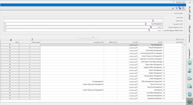 1- فتح ورقة جديدة لإنشاء إدارة جديدة . 2- ادخال اسم الإدارة فقط فى حالة إذا كانت هذه الإدارة رئيسية . 3- أما فى حالة إن كانت الإدارة فرعية فيتم كتابة اسم الإدارة كما فى (2) ثم اختيار الإدارة الرئيسية التى ستكون ضمنها . 4- يمكن اختيار حساب مصروفات ترحل إليه المرتبات . 5- و يمكن اختيار مراكز التكلفة المربوطة بحساب مصروفات المرتبات تلك . 6- ثم حفظ . 7- و يمكن التعديل على كل تلك البيانات . 8- أو حذف الإدارة بأكملها .