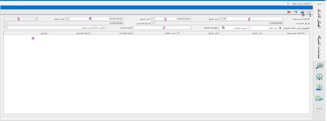 -فتح إجازة جديدة -يتم إدخال اسم الإجازة -عدد أيام العمل فى هذه الإجازة -عدد أيام العطلة المحددة فى هذه الإجازة -ثم حفظ و يمكن التعديل على أى بيانات لأى إجازة .