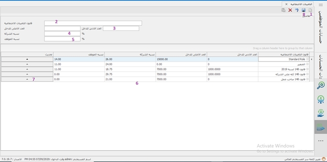 شاشة التأمينات الإجتماعية يتم إدخال مسمى لكل نوع تأمين تحدده الشركة و يتم من خلالها حساب الحد الأعلى و الأدنى للتأمين من قيمة الدخل و النسبة التى يدفعها الموظف من مرتبه لذلك التأمين و نسبة الشركة التى تدفعها أيضًا للتأمين على الموظف