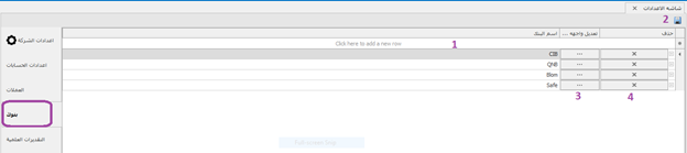 يتم إنشاء جميع البنوك التى تتعامل معاها الشركة من خلال شاشة البنوك