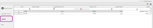 -كتابة اسم العملة باللغة الإنجليزية -كتابة نفس العملة باللغة العربية -كتابة أصغر جزء للعملة (القروش) باللغة الإنجليزية -كتابة أصغر جزء للعملة (القروش) باللغة العربية -ادخال آخر معامل عملة -ثم حفظ