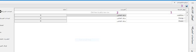 -ادخال اسم موفر الخدمة (اسم خط الاتصال) -تحت أى حساب مصروفات سيتم دفع قيم فواتير هذه الخدمة -ثم حفظ