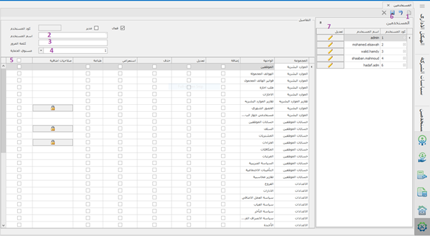 1- فتح شاشة المستخدمين . 2- ادخال اسم المستخدم . 3- ادخال كلمة خاصة لذلك المستخدم فقط و المستخدم الرئيسى فقط هو المتحكم بهذه الكلمة . 4- تحديد مستوى الحماية أى يحق لهذا المستخدم رؤية البيانات التى يدخلها المستخدمين الأقل منه . 5- إعطاء صلاحية للمستخدم على جميع الشاشات أو بعضها أو حتى لو شاشة واحدة يمكن التحكم فى الإضافة لهذه الشاشة أو التعديل عليها أو حذف بيان منها أو طباعة تقرير لها . 6- ثم حفظ . 7- يمكن التعديل على بيانات أى مستخدم .