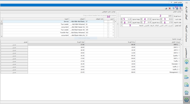 م إنشاء ورديات للعمل من هذه الشاشة و تحديد مواعيد بدء و انتهاء الوردية و تطبيق هذه وردية أو أكثر على الموظفين .