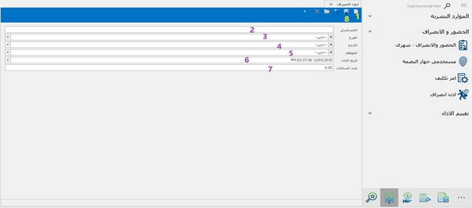 -الضغط على جديدة -ادخال المسلسل -اختيار الفرع -اختيار الادارة -اختيار الموظف -ادخال تاريخ الاذن -ادخال عدد ساعات الاذن -ثم الضغط على حفظ