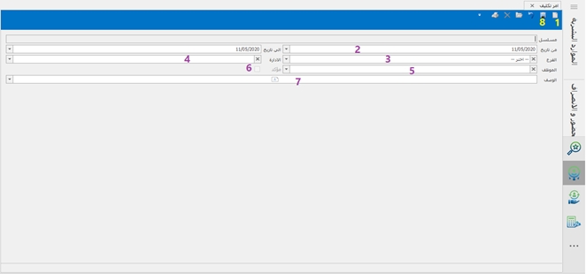 -الضغط على جديد -ادخال التاريخ -اختيار الفرع -اختيار الاداره -اختيار الموظف -تأكيد امرالتكليف -ادخال الوصف -حفظ