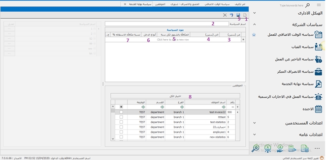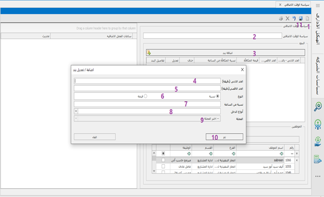 يعمل بعض الموظفين وقت إضافى بجانب عدد ساعات العمل الأساسية و ذلك لإنهاء عمل لم ينتهى أو البدء فى عمل جانبى للمنظومة , لذلك يتم احتساب ساعات العمل الإضافية تلك ضمن سياسات , و يكون المقابل إما زيادة فى ىعدد الساعات أو فى المرتب . و يتم إنشاء سياسة الوقت الإضافى بهذا الشكل :- 1- فتح ورقة عمل جديدة . 2- كتابة مسمى للسياسة . 3- الضغط على إضافة بنود لتلك السياسة من حيث أن كل سياسة تختلف عن الأخرى من حيث الشروط و بدء وانتهاء ساعات العمل والمقابل المادى لكل سياسة. ظهر شاشة يتم فيها إضافة أو تعديل بنود أى سياسة من خلال:- 4 - كتابة الحد الادنى بالدقائق . 5 –كتابة الحد الاقصى بالدقائق . 6- اختيار نوع المقابل للوقت الإضافى أكان المقابل نسبة إضافية على المرتب أو مبلغ محدد . 7- ادخال النسبه التي يتم احتسابها على مستوى الساعه الواحده. 8-اختيار نوع الدخل في حاله ان النوع نسبه 9- اختيار العمله في حاله ان النوع قيمه 10-الضغط على تم . 11-ثم حفظ.