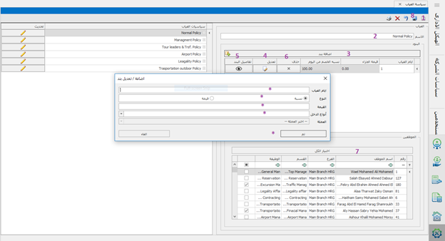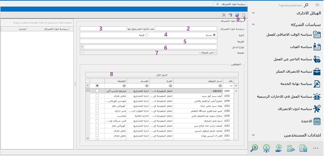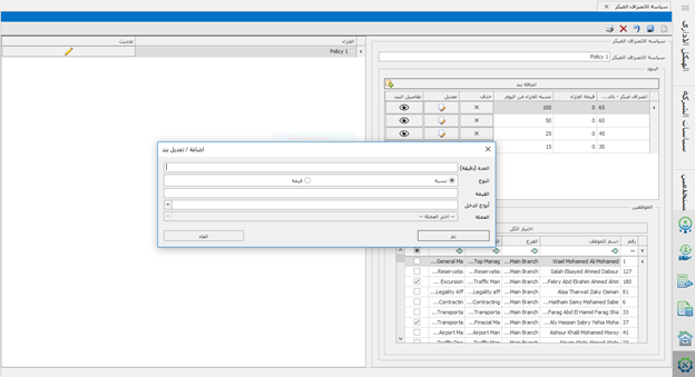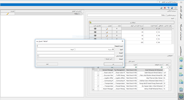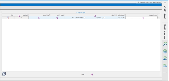 و يتم إنشاء سياسة بهذا الشكل :- 1- فتح ورقة عمل جديدة . 2- كتابة مسمى للسياسة . 3- ادخال عدد مرات الاذون المتاحه. 4- اختيار نوع الجزاء اذا كان نسبة من المرتب أو مبلغ محدد . 5- ادخال القيمه. 8-اختيار نوع الدخل في حاله ان النوع نسبه 9- اختيار العمله في حاله ان النوع قيمه 10-اختيار الموظفين 11-ثم حفظ.