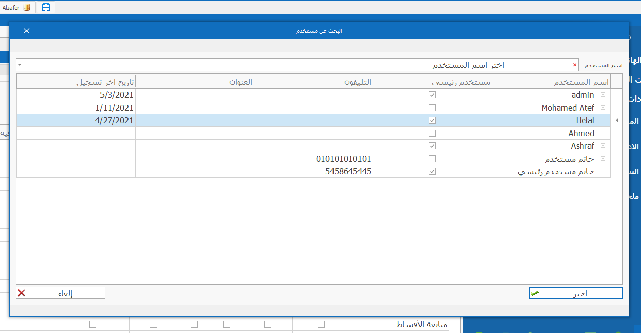 تظهر قائمة بالمستخدمين الحاليين للسيستم وتظهر بعض البيانات التي تخص المستخدم، ولعرض كام البيانات والصلاحيات يتم تحديد المستخدم ثم الضغط علي زر اختر اسفل الشاشة، ليتم إظهار كامل البيانات للمستخدم مع إمكانية التعديل علي صلاحياته ثم الضغط علي حفظ.