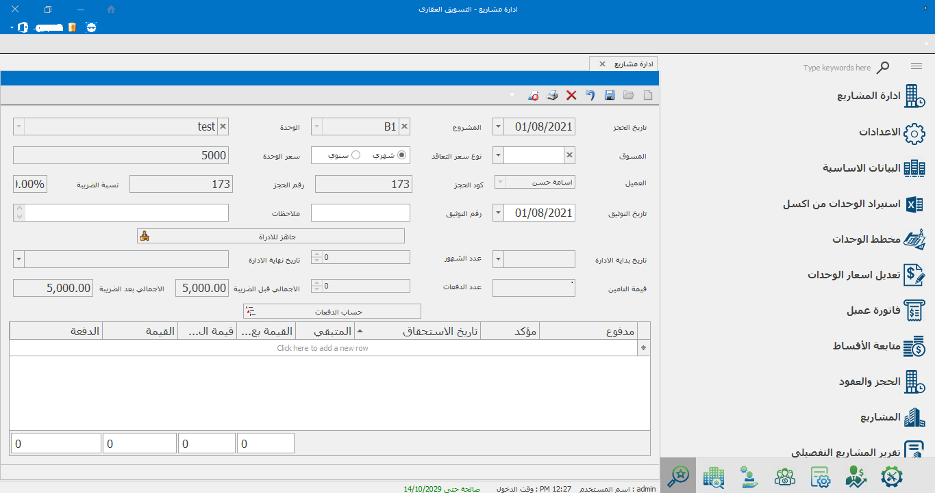 يتم في هذه الشاشة الضغط علي جاهز للإدارة ليتم إستكمال بيانات الإدارة، فيتم تحديد تاريخ بداية الإدارة وعدد الأشهر المتفق عليها وذكر قيمة التأمين اذا كانت موجودة واذا كانت غير موجودة يكتب صفر ثم الضغط علي حساب الدفعات ليظهر البرنامج الدفعات مقسمة علي الأشهر ثم يتم الحفظ.