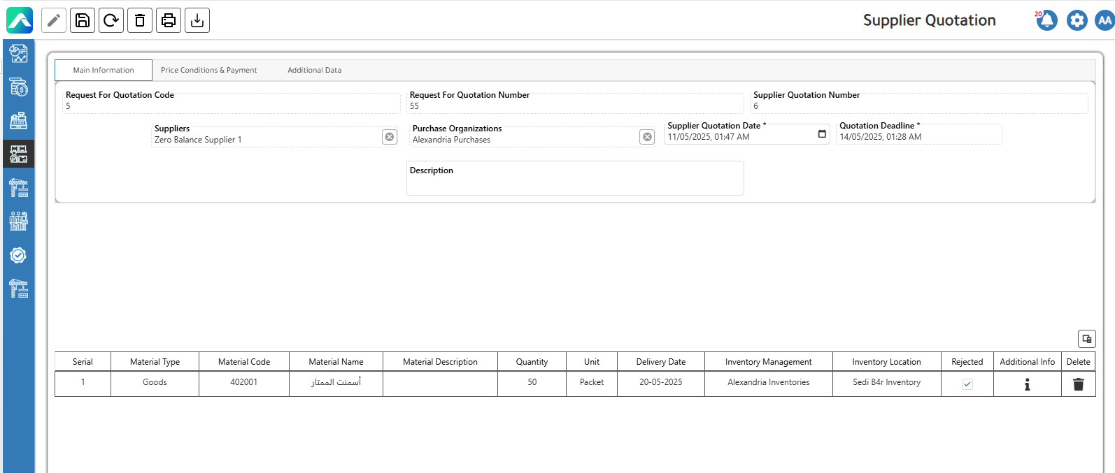 Before committing to a supplier, the company typically seeks out the most competitive offer. The procurement department sends requests for quotations (RFQs) to multiple suppliers. These suppliers respond with pricing, delivery timelines, and terms. AccFlex allows you to enter each of these quotations into the system this is managed through Supplier Quotation stage, and then they can be compared and evaluated based on price, availability, and contractual conditions. This process helps ensure that procurement decisions are well-informed and economically sound.