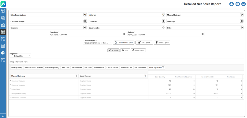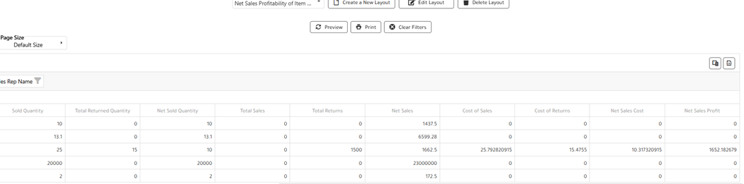 In this report design, a Net Sales Cost column has been added to display the total cost of the net quantity sold for each item in the system’s local currency, along with a Net Sales Profit column that shows the difference between Net Sales and Net Sales Cost, also in the local currency.