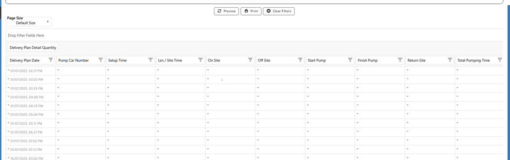 A new report has been added to display the pump movements, showing the delivery plan date, the pump truck number, the project name, the delivery plan quantity, and the time .
