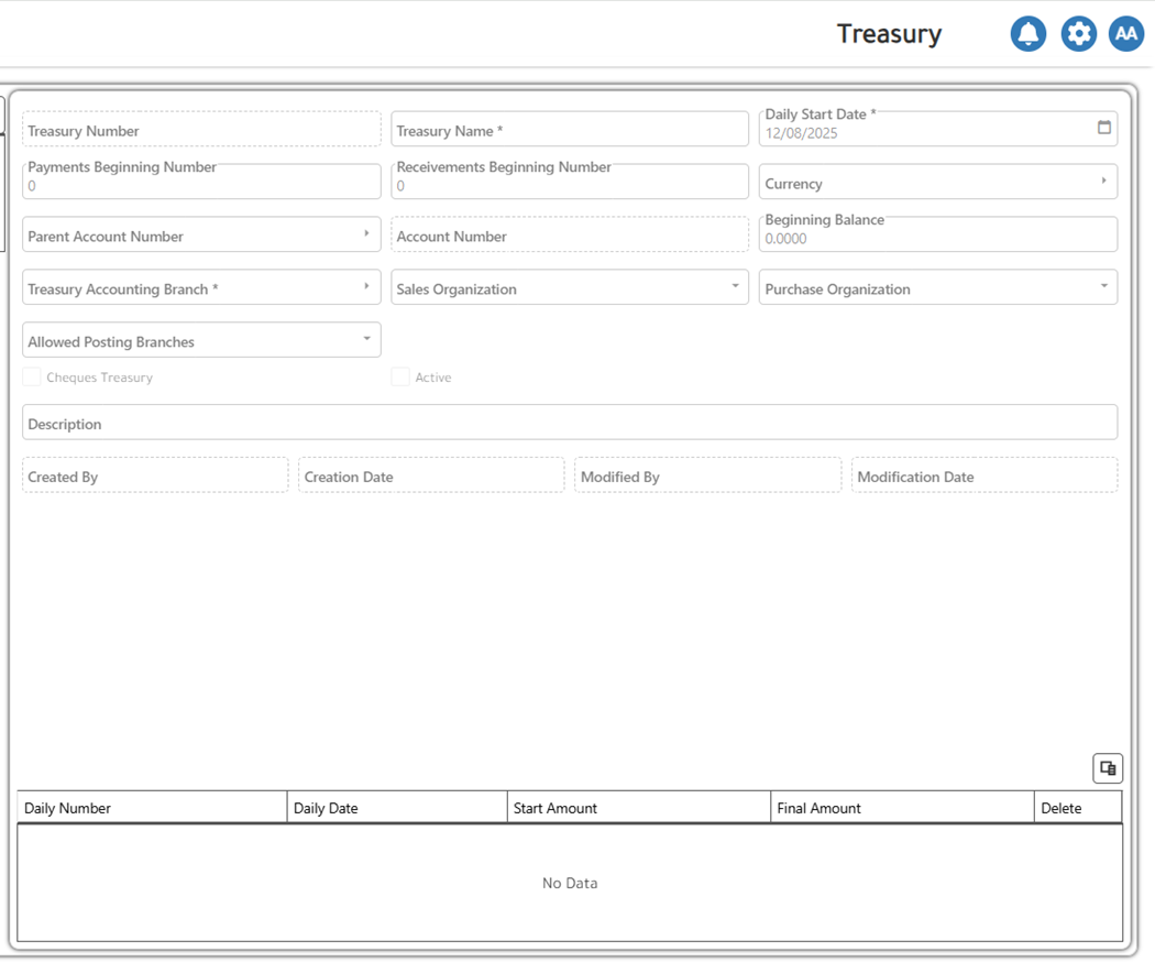 · Customers, suppliers, and accounts are now filtered to display only those linked to the branches permitted for the treasury to deal with, across all receipts, payments, and letters of guarantee screens.