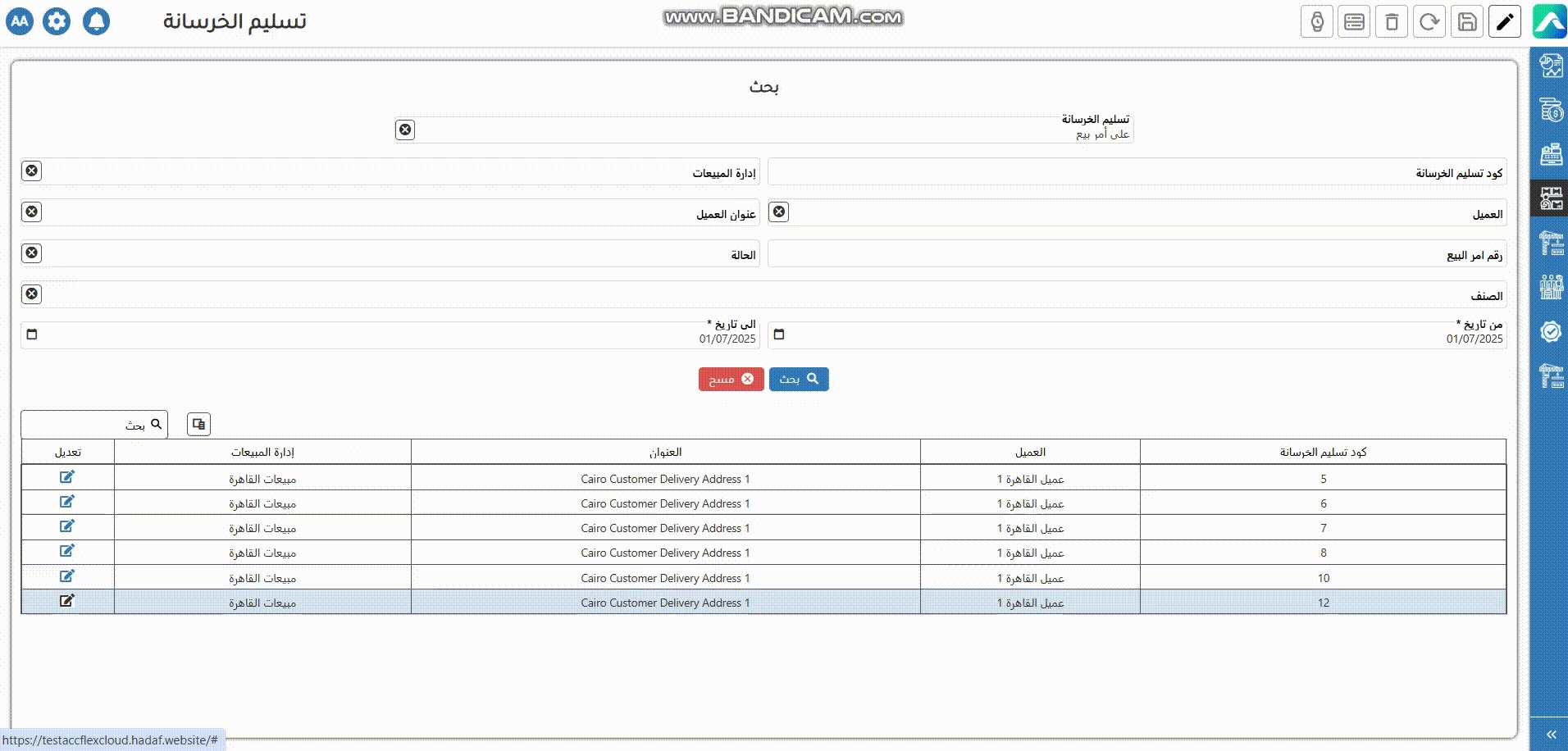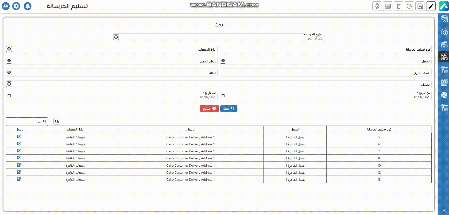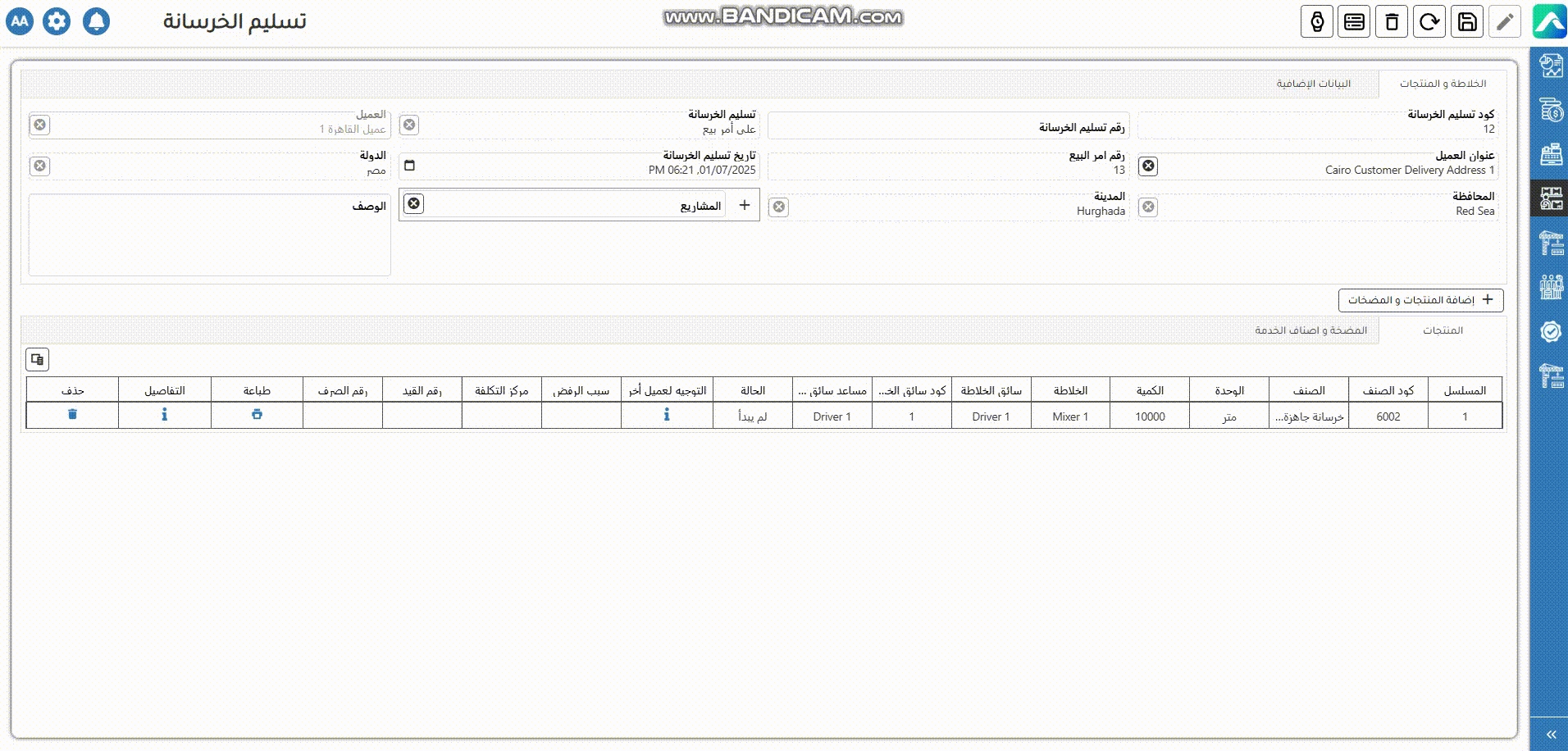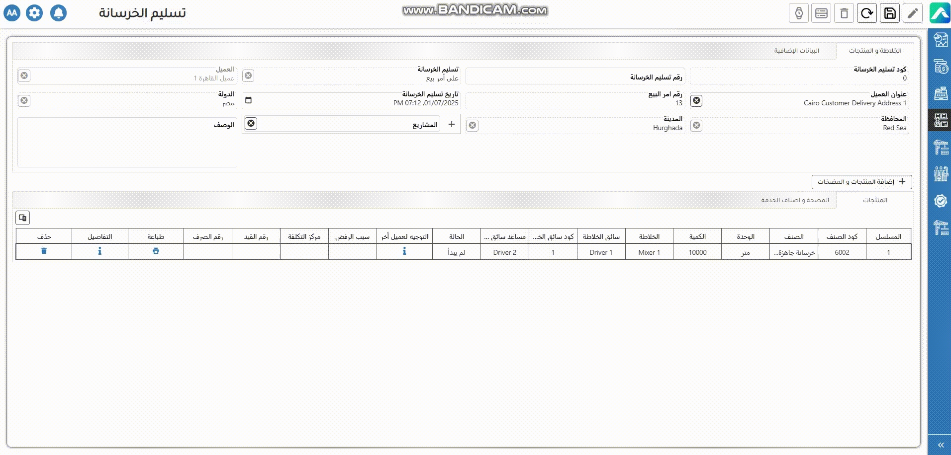 ٢. تم التسليم عندما يقبل العميل الاستلام الخرسانة، ينشئ النظام قيد يومية خاص بعملية الاستلام، وفي تلك المرحلة يمكن إنشاء الفاتورة يدويًا.