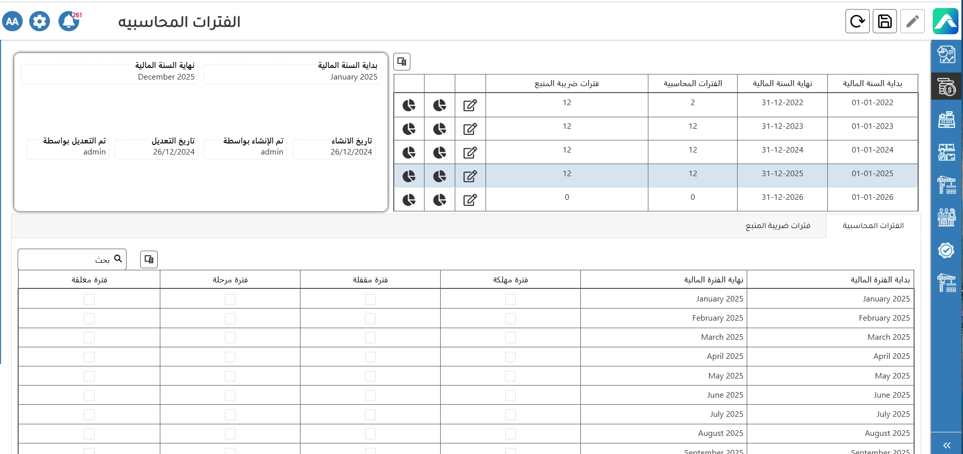 • تحديد والتحكم في الفترات المالية للمعاملات.