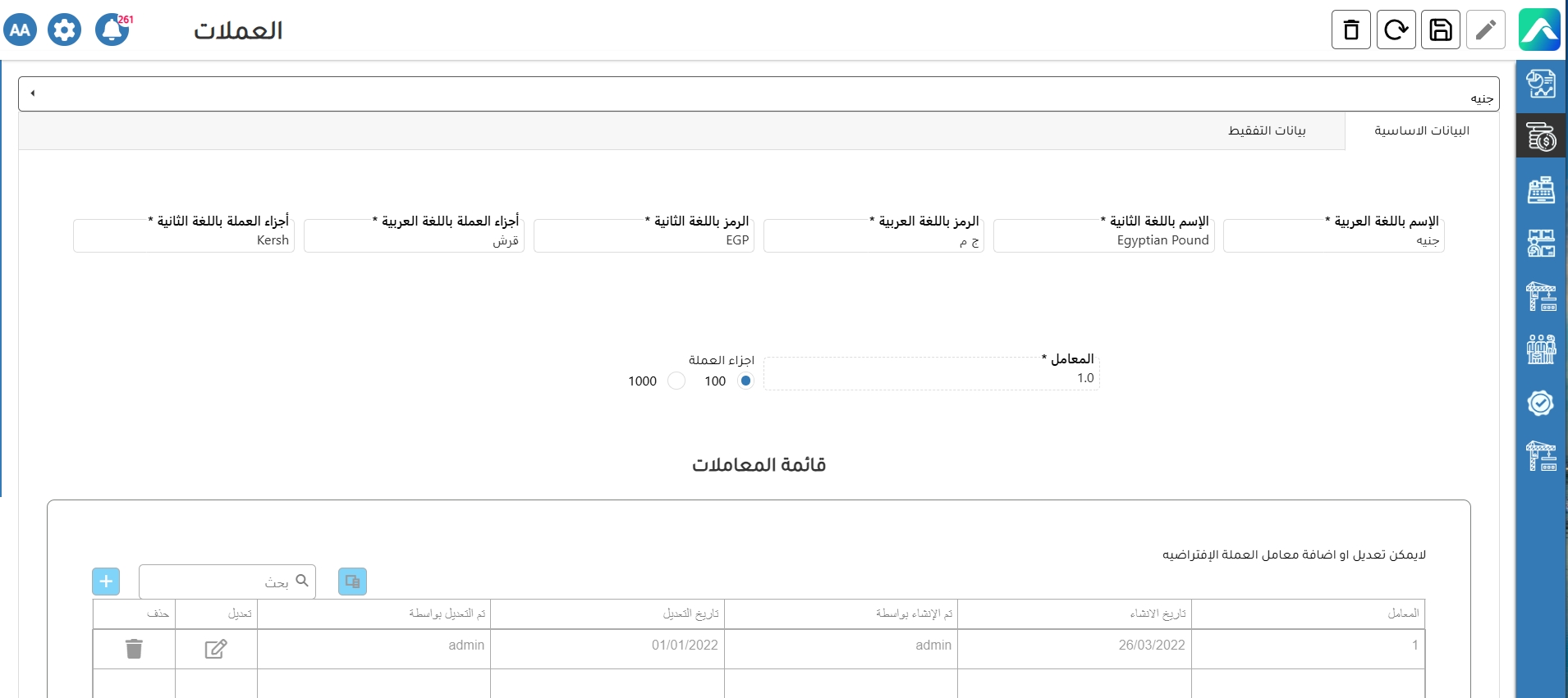 • إعداد العملات الأساسية والأجنبية مع أسعار الصرف للمعاملات متعددة العملات.