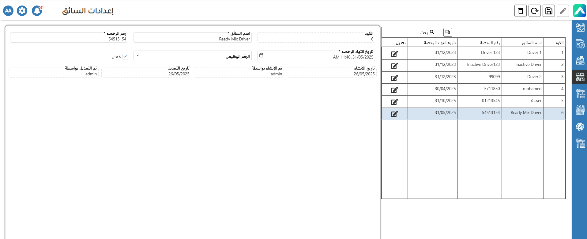 الإعدادات العامة الإعدادات العامة هي المكان الذي يمكن للمستخدمين فيه تحديد الشاشات مثل البلدان، شروط الدفع، السيارات، السائقين، سياسات العمولة وما إلى ذلك. • في شاشة إعدادات السائق، يُعرَّف السائق بأنه فرد مسؤول عن توصيل البضائع—مثل الخرسانة الجاهزة—التي تُسجل وتُدار معلوماتها داخل النظام. تلتقط الشاشة التفاصيل الرئيسية مثل اسم السائق، رقم الرخصة، وتاريخ الانتهاء.