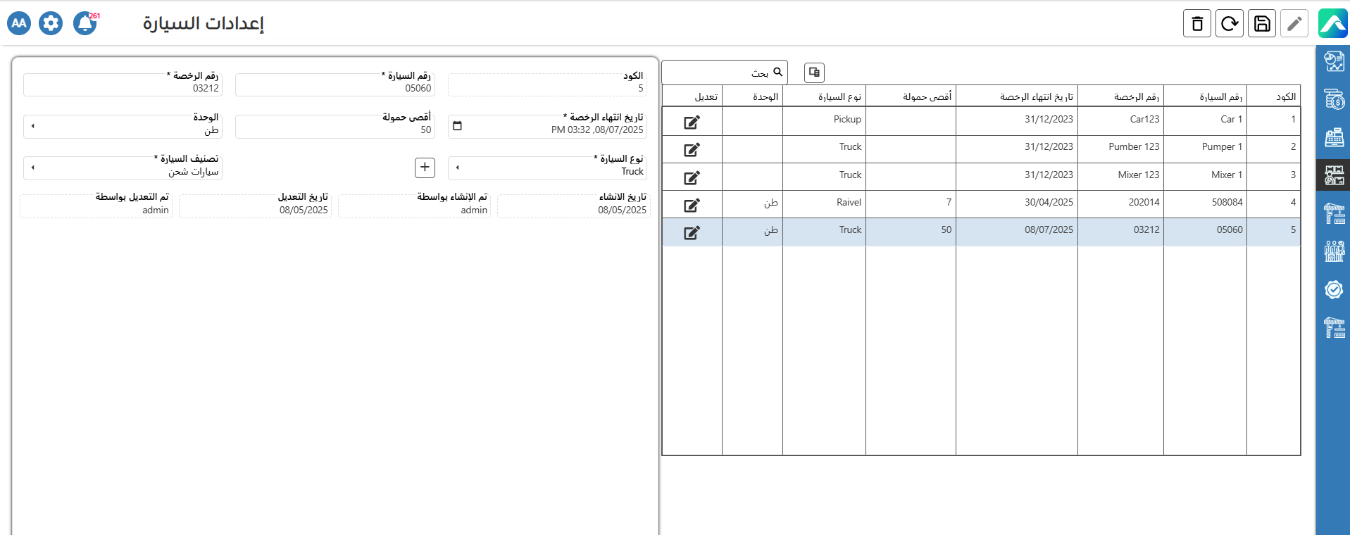 • تُستخدم شاشة السيارة لتسجيل وإدارة المعلومات المهمة عن كل سيارة تستخدم لنقل البضائع أو الخرسانة.