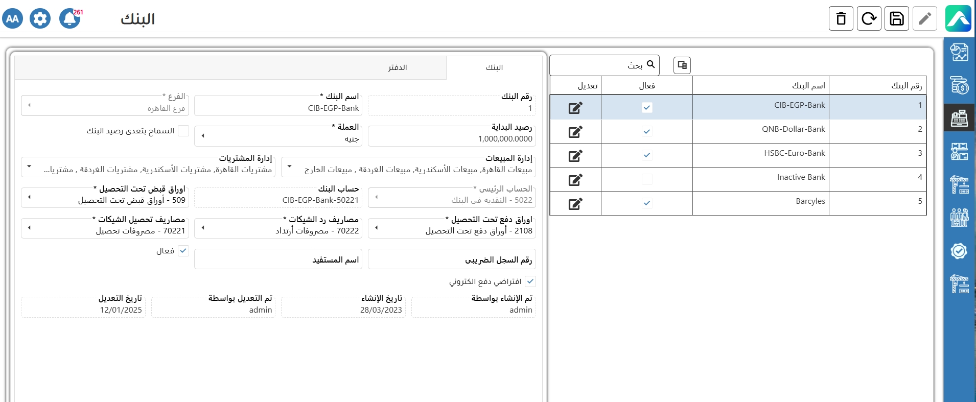 شاشة "البنك" هي قسم ضمن نظام محاسبي أو مالي يعرض ويدير المعلومات المتعلقة بحسابات البنك الخاصة بالشركة.