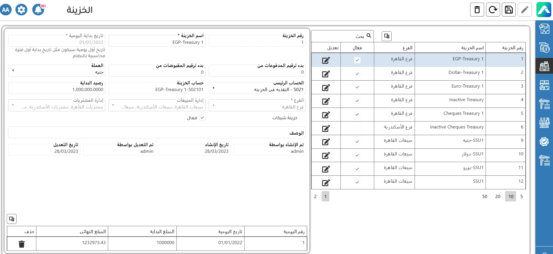 تعريفات إدارة التقدية هي عملية الإشراف وإدارة جميع الأنشطة المتعلقة بالنقد—مثل الخزينة، الشيكات، والتحويلات البنكية—لضمان معاملات استلام ودفع آمنة، دقيقة، ومصرح بها. يتضمن ذلك وضع إجراءات مناسبة لجمع الأموال الواردة ومعالجة المدفوعات الصادرة، مما يساعد على الحفاظ على السيولة، ومنع الاحتيال، والتأكد من تسجيل جميع الحركات المالية والتحكم فيها بشكل صحيح. • شاشة" الخزينة" هي قسم أو واجهة ضمن نظام المحاسبة أو إدارة المالية تُستخدم لإدارة أنشطة النقد والسيولة في الشركة.